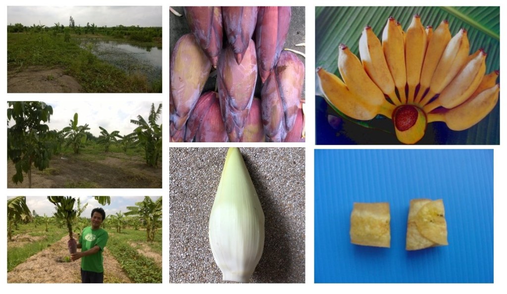 Water management and soil grooving for drainage and drought solutions for banana and mahogany plantations have been prepared after the first rain in July 2016. We have planted banana (Musa ABB cv. Kluai Namwa, กล้วยน้ำว้า) as mono-crop on the ridge and furrow systems and mahogany (Swietenia mahogany, มะฮอกกานี) surrounding the 3-meter deep water reservoir, which was quite acidic, clear and green in 2016.