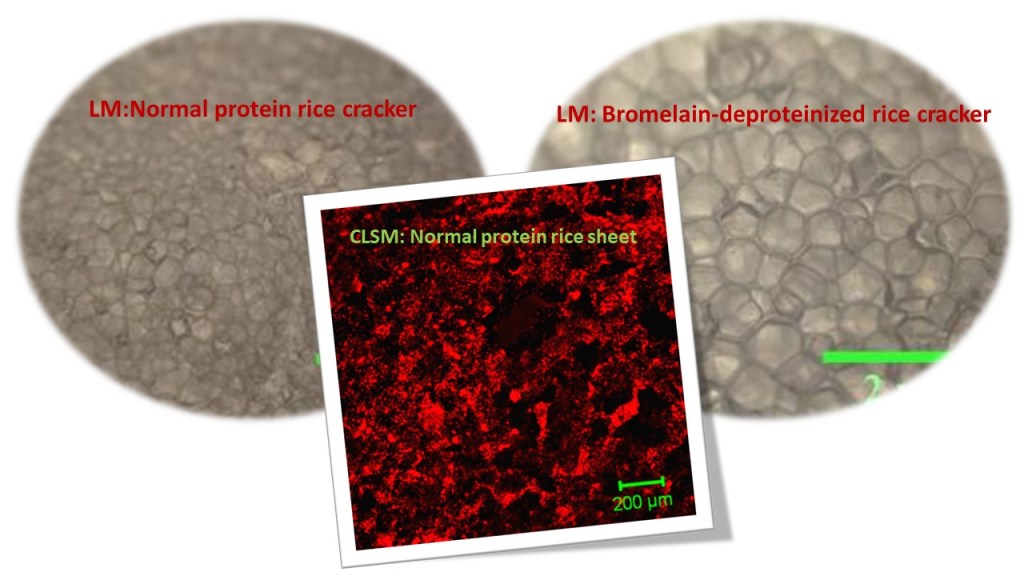 เมื่อนำเมล็ดข้าวไปตากแห้งแล้วนำมาทอดเพื่อผลิตขนมขบเคี้ยวดังเช่นข้าวแตนจากข้าวเหนียว หรือข้าวตังจากข้าวเจ้า การขยายตัวของเมล็ดข้าวแห้งระหว่างการทอด และการเข้าถึงโมเลกุลสตาร์ชในระหว่างการย่อยข้าวด้วยเอนไซม์ในระบบทางเดินอาหารถูกกำกับด้วยโครงข่ายของโปรตีนในเนื้อเมล็ดข้าวว่ามีปริมาณมากหรือน้อย มีความหนาแน่นของโครงข่ายอย่างไร หรือเกิดพันธะเคมีที่เอนไซม์ในร่างกายย่อยได้หรือไม่