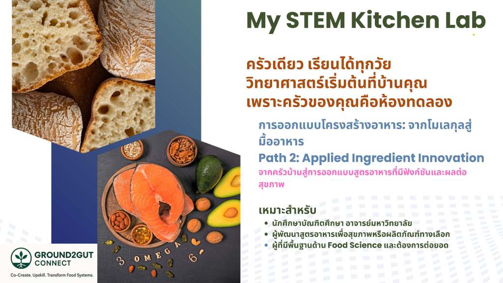 หากคุณมีพื้นฐานด้าน Food Science และต้องการต่อยอดสู่การออกแบบสูตรอาหารที่มีฟังก์ชันเฉพาะ—Path 2 จะเปิดพื้นที่ให้คุณทดลองคิด วิเคราะห์ และสร้างสรรค์สูตรอาหารจากครัวบ้านของคุณเอง หลักสูตรนี้จะพาคุณเข้าสู่โลกของการควบคุมโครงสร้างผ่านการแปรรูป การเลือกใช้วัตถุดิบทางเลือกเพื่อสุขภาพ และการประเมินสูตรด้วยเครื่องมือที่ใช้ในงานวิจัยจริง เช่น formulation canvas และ rubric ที่ออกแบบมาเพื่อวิเคราะห์โครงสร้างและผลกระทบต่อสุขภาพ คุณจะได้ฝึกออกแบบสูตรเจล อิมัลชัน หรือโฟมที่มีความเสถียรและตอบโจทย์ผู้บริโภคยุคใหม่ พร้อมเรียนรู้วิธีสื่อสารผลลัพธ์ในรูปแบบที่นำไปสอนต่อหรือใช้ในงานวิจัยได้ทันที Path นี้เหมาะสำหรับนักวิจัยใหม่ นักศึกษาปริญญาโท หรืออาจารย์มหาวิทยาลัยที่ต้องการเชื่อมโยงทฤษฎีกับการออกแบบจริง