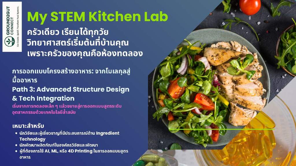 ไม่ว่าคุณจะอยู่ในจุดเริ่มต้นของการเรียนรู้ หรือกำลังมองหาวิธีต่อยอดงานวิจัยของคุณ หลักสูตรนี้จะพาคุณเดินทางจากโมเลกุล…สู่มื้ออาหารที่ออกแบบด้วยความเข้าใจ ความตั้งใจ และความสามารถในการควบคุมโครงสร้างอย่างแท้จริง